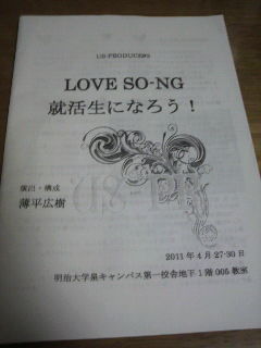 【観劇】US-PRODUCE『LOVE SO-NG/就活生になろう!』 2011年05月23日 03:34 US-PRODUCE#3『LOVE SO-NG/就活生になろう!』演出・構成:薄平広樹2011年4月27〜30日入場無料@明治大学和泉キャンパス第一校舎地下1階005教室 US-PRODUCEは、その視点が面白い。普通に「演劇を観る」という体験からはちょっとずれた感覚を味わえるから好きだ。二作品の上演だったが、どちらも、彼らが「今だからこそ向き合える何か」に演劇を通じて向き合っている印象。良いんじゃないだろうか。 「【観劇の記録】」カテゴリの最新記事 < 前の記事次の記事 > コメント コメントフォーム 名前 コメント 評価する リセット リセット 顔 星 投稿する 情報を記憶